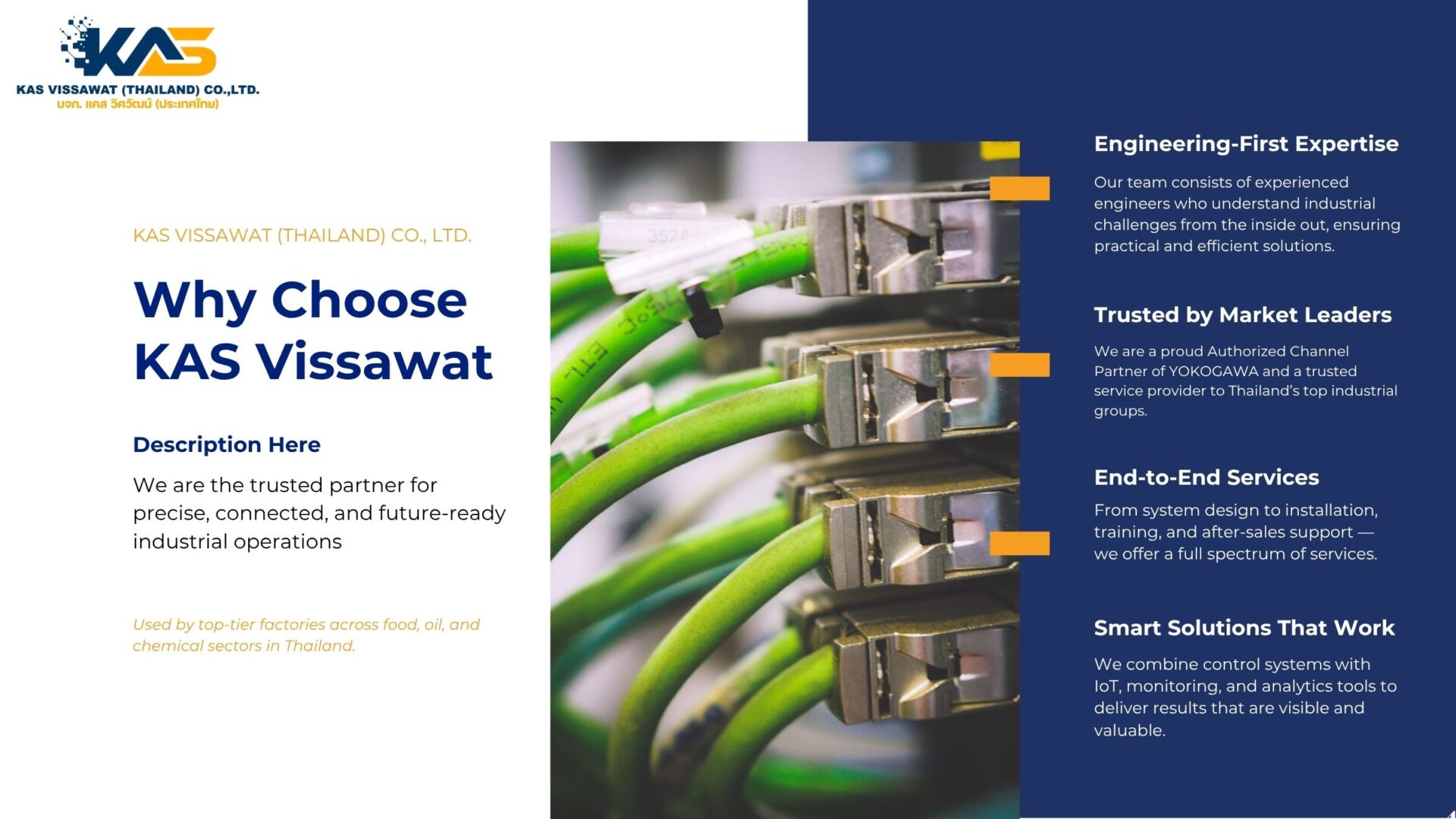 Kas Vissawat is an engineering company specializing in industrial measurement and control systems. We provide comprehensive services including system design, installation, consultation, and digital transformation through IoT technology.